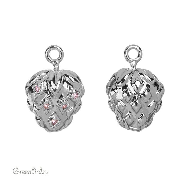 Фурнитура для бижутерии - объемная подвеска в форме клубники, украшенная фианитами. Материал: латунь, покрытие: родий. Размер с колечком: 12 х 8 мм, внутренний диаметр колечка: 1,2 мм. Производство: Китай. Цена указана за 1 шт.