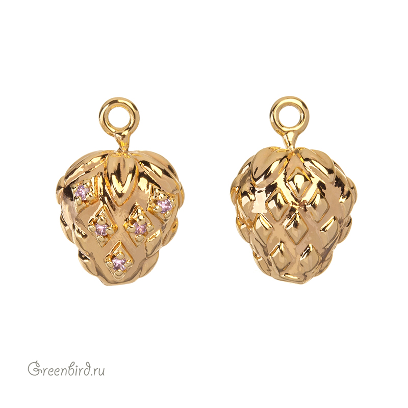 Фурнитура для бижутерии - объемная подвеска в форме клубники, украшенная фианитами. Материал: латунь, покрытие: золото. Размер с колечком: 12 х 8 мм, внутренний диаметр колечка: 1,2 мм. Производство: Китай. Цена указана за 1 шт.