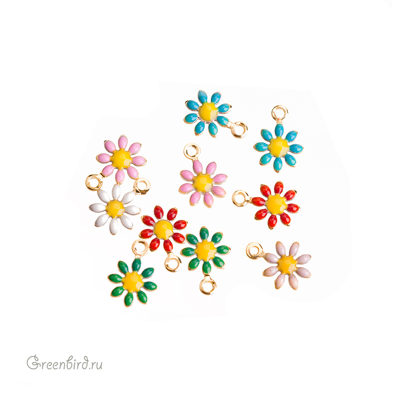Элемент для бижутерии - подвеска двусторонняя с эмалью в форме цветка. Материал: латунь, покрытие: золото. Цвет эмали: разноцветный микс. Размер с колечком: 10,1 мм, толщина: 2 мм. Производство: Китай. Цена указана за упаковку (10 шт.).