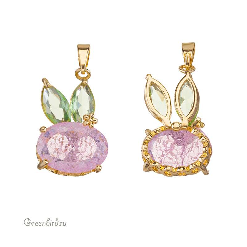 Элемент для бижутерии - подвеска в форме ягодки из кристаллов. Материал: латунь, покрытие: золото. Цвет вставки: розовый, зеленый. Размер подвески с колечком: 22 х 14 мм, внутренний размер бейла: 3 x 2,5 мм. Производство: Китай. Цена указана за 1 шт.