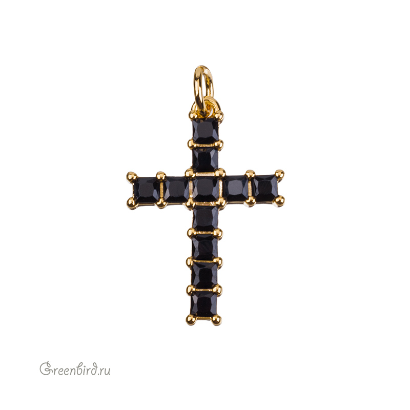 Фурнитура для бижутерии - подвеска в форме крестика с кристаллами. Материал: латунь, покрытие: золото. Цвет вставки: черный. Размер с колечком: 25 х 15 х 2 мм, внутренний диаметр колечка: 3,3 мм. Производство: Китай. Цена указана за 1 шт.