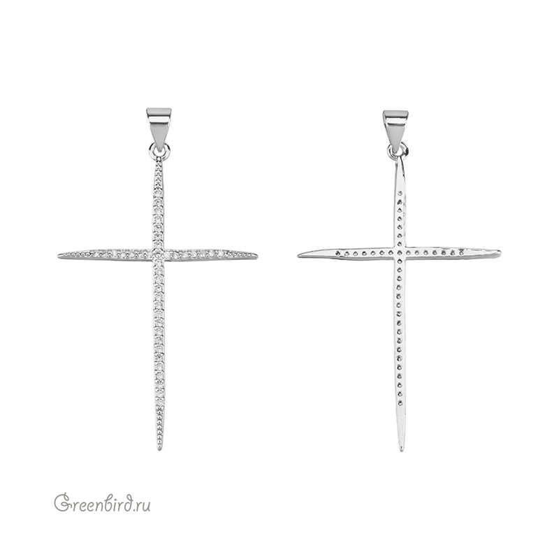 Фурнитура для бижутерии - подвеска в форме крестика с фианитами. Материал: латунь, покрытие: родий. Цвет вставки: Crystal. Размер с колечком: 45 х 29 х 1,7 мм, внутренний диаметр колечка: 1,5 мм. Производство: Китай. Цена указана за 1 шт.