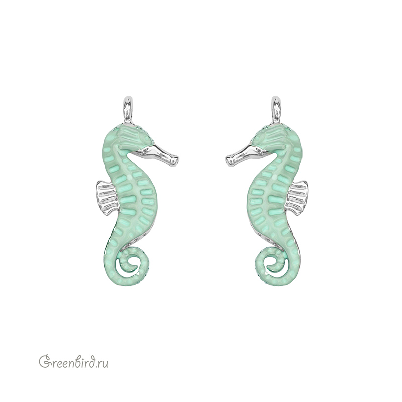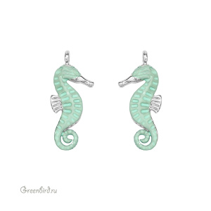 Фурнитура для бижутерии - подвеска в виде морского конька. Материал: латунь, покрытие: родий. Цвет эмали: светло-зеленый. Размер подвески с колечком: 22 х 9 мм, толщина 3 мм, внутренний диаметр колечка: 1,6 мм. Производство: Китай. Цена указана за 1 шт.