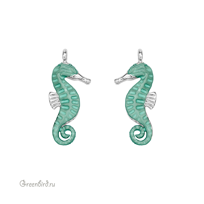 Фурнитура для бижутерии - подвеска в виде морского конька. Материал: латунь, покрытие: родий. Цвет эмали: зеленый. Размер подвески с колечком: 22 х 9 мм, толщина 3 мм, внутренний диаметр колечка: 1,6 мм. Производство: Китай. Цена указана за 1 шт.