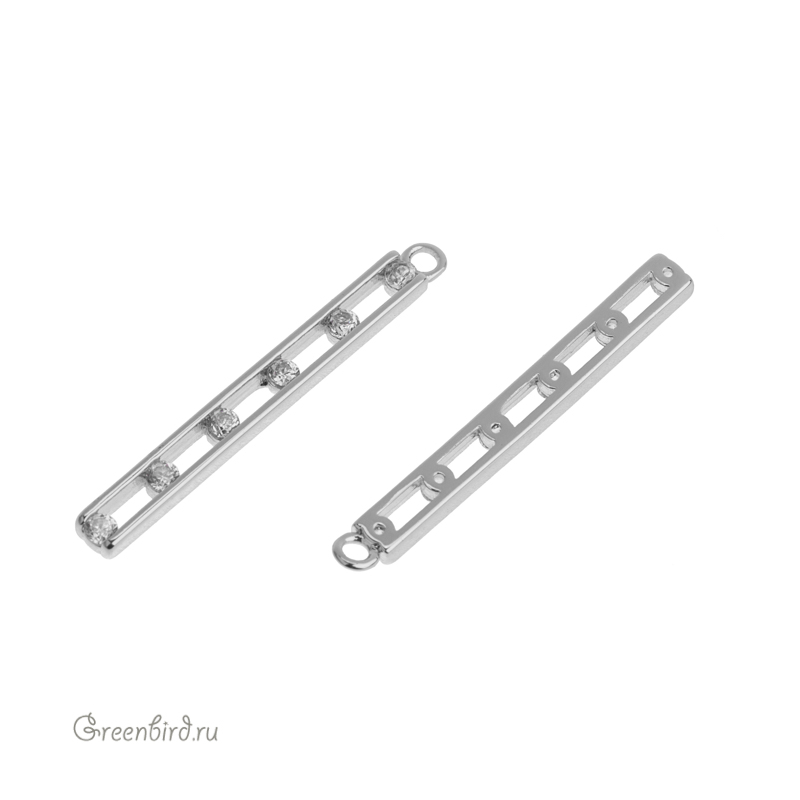 Фурнитура для бижутерии - подвеска-коннектор с фианитами. Подходит для крепления тонкого шнура или ленты. Материал: латунь, покрытие: родий. Размер с колечком: 3,15 х 29,8 мм, внутренний размер отверстий: 3 х 1,4 мм, колечко: 1,5 мм. Производство: Китай. Цена указана за 1 шт.