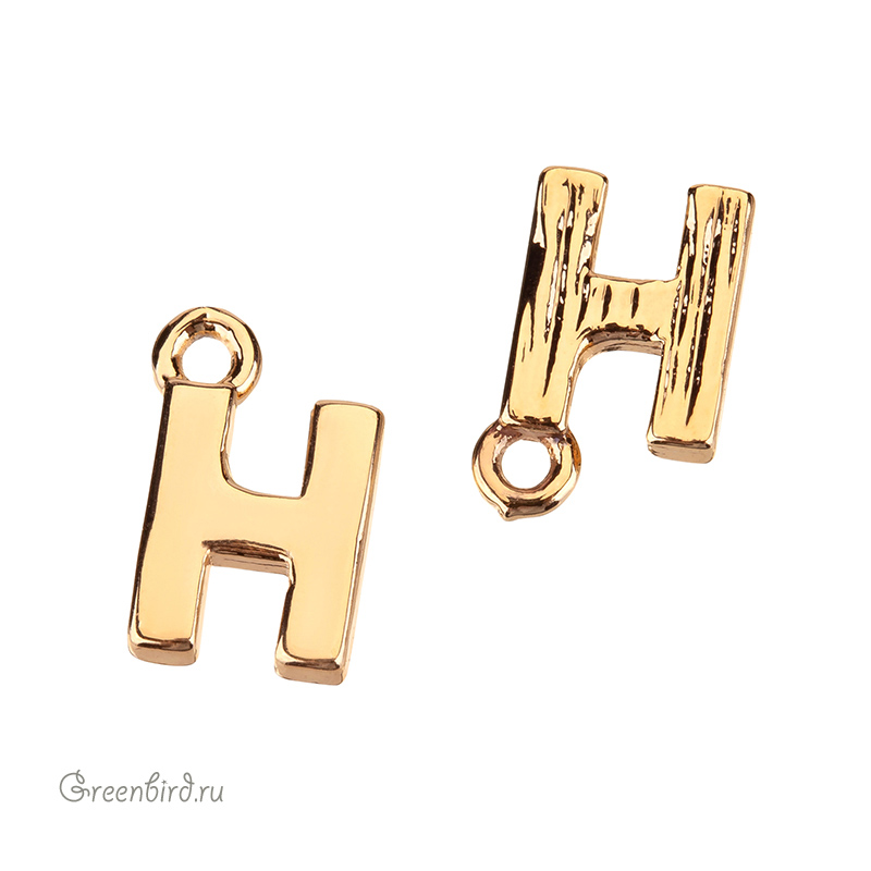 Фурнитура для бижутерии - подвеска в форме буквы «H», гладкая с лицевой стороны и фактурная с другой. Материал: латунь, покрытие: золото. Размер с колечком: 8 х 5 мм, толщина: 1,3 мм, внутренний диаметр колечка: 0,7 мм. Производство: Китай. Цена указана за 1 шт.