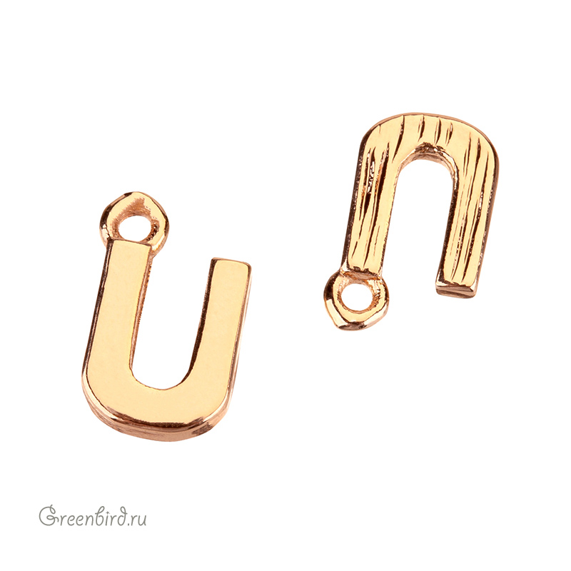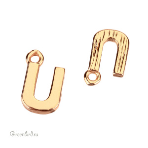 Фурнитура для бижутерии - подвеска в форме буквы «U», гладкая с лицевой стороны и фактурная с другой. Материал: латунь, покрытие: золото. Размер с колечком: 8 х 5 мм, толщина: 1,3 мм, внутренний диаметр колечка: 0,7 мм. Производство: Китай. Цена указана за 1 шт.