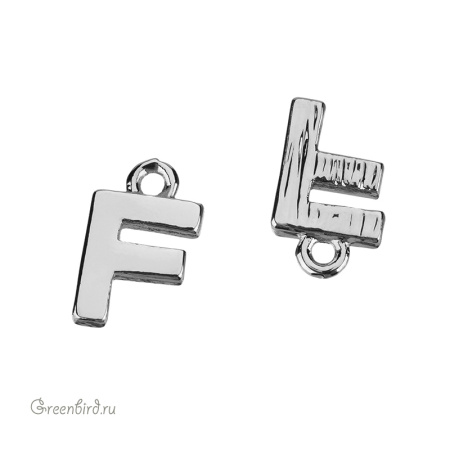 Фурнитура для бижутерии - подвеска в форме буквы «F», гладкая с лицевой стороны и фактурная с другой. Материал: латунь, покрытие: родий. Размер с колечком: 7,8 х 5 мм, толщина: 1,3 мм, внутренний диаметр колечка: 0,7 мм. Производство: Китай. Цена указана за 1 шт.