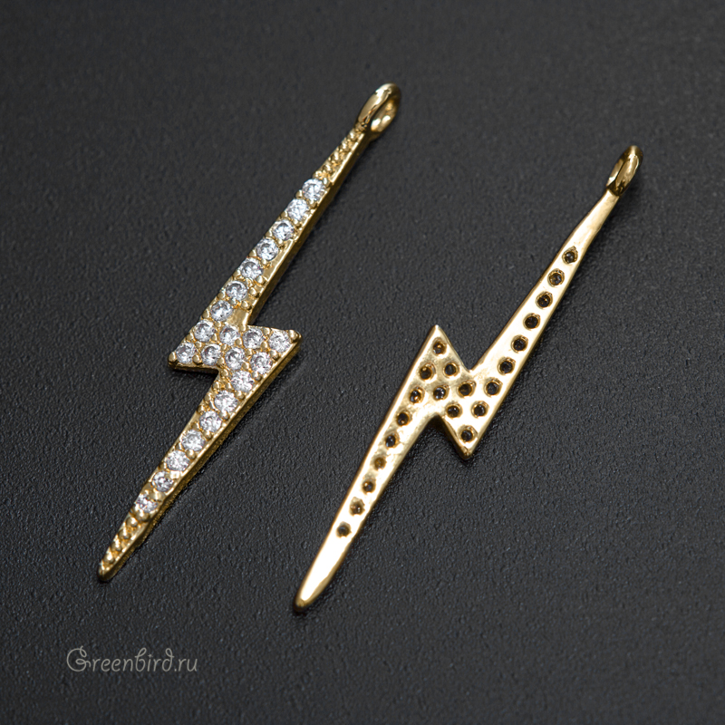 Фурнитура для бижутерии - подвеска в форме молнии, с одной стороны украшенная фианитами. Материал: латунь, покрытие: светлое золото. Размер с колечком: 4,9 х 28 мм, внутренний диаметр колечка: 1,5 мм. Производство: Китай. Цена указана за 1 шт.