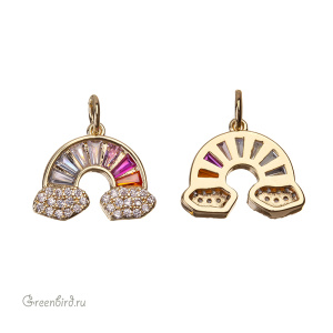 Фурнитура для бижутерии - подвеска в форме радуги с разноцветными фианитами. Материал: латунь, покрытие: золото. Цвет вставки: разноцветный. Размер с колечком: 16,5 х 15,5 х 3,2 мм, внутренний диаметр колечка: 3,5 мм. Производство: Китай. Цена указана за 1 шт.