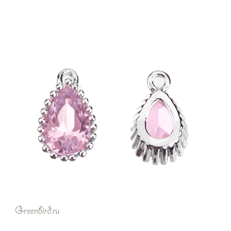 Фурнитура для бижутерии - подвеска в форме капли с фианитом. Материал: латунь, покрытие: родий. Цвет вставки: бледно-розовый. Размер с колечком: 8,4 х 5,1 х 2,5 мм, высота подвески без колечка - 7 мм, внутренний диаметр колечка: 1,1 мм. Производство: Китай. Цена указана за 1 шт.