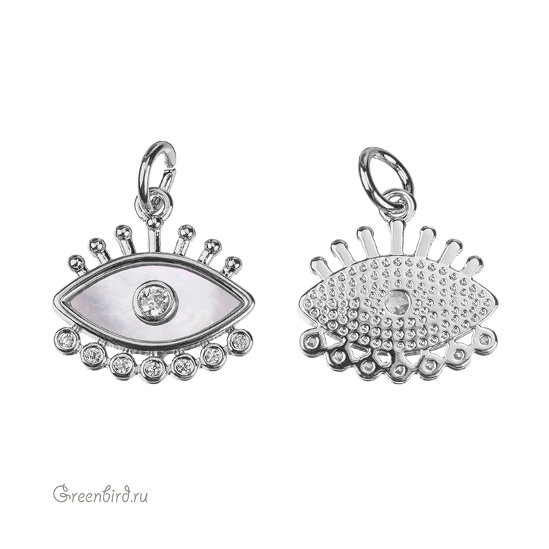 Фурнитура для бижутерии - подвеска с фианитами и перламутром. Материал: латунь, покрытие: родий. Цвет вставки: прозрачный / белый. Размер с колечком: 17,5 х 14 х 2,5 мм, высота подвески без колечка - 14 мм, внутренний диаметр колечка: 3,3 мм. Производство: Китай. Цена указана за 1 шт.