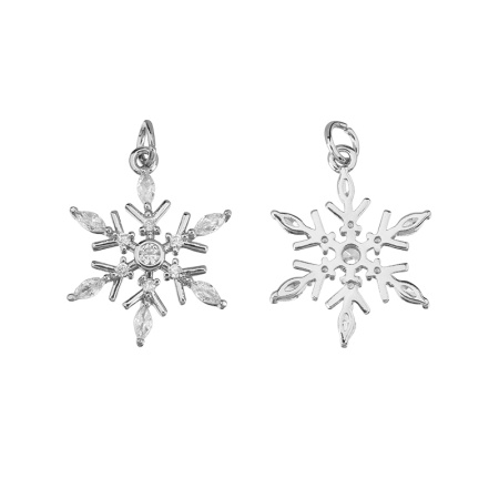 Фурнитура для бижутерии - подвеска в форме снежинки, с одной стороны украшенная фианитами. Материал: латунь, покрытие: родий. Размер с колечком: 23 х 17 мм, внутренний диаметр колечка: 1,1 мм, внутренний диаметр соединительного кольца: 3,5 мм. Производство: Китай. Цена указана за 1 шт.