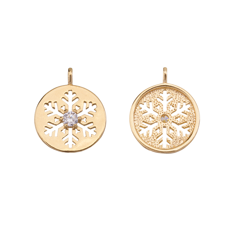 Фурнитура для бижутерии - подвеска в форме снежинки, с одной стороны украшенная фианитами. Материал: латунь, покрытие: золото. Размер с колечком: 14 x 12 мм, внутренний диаметр колечка: 1 мм. Производство: Китай. Цена указана за 1 шт.