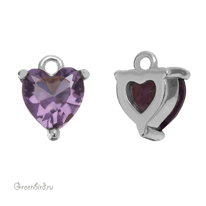 Фурнитура для бижутерии - подвеска в форме миниатюрного сердца с фианитом. Материал: латунь, покрытие: родий. Цвет вставки: фиолетовый. Размер с колечком: 7 х 5,3 х 3,5 мм, внутренний диаметр колечка: 1 мм. Производство: Китай. Цена указана за 1 шт.