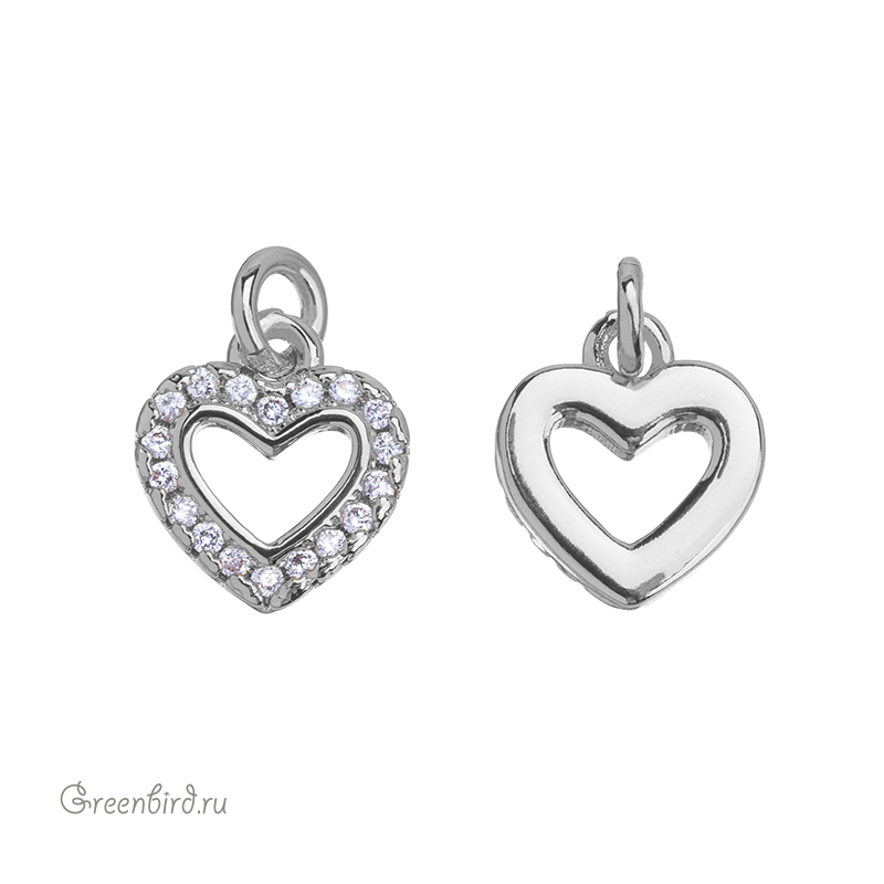 Фурнитура для бижутерии - подвеска в форме сердечка, украшенная фианитами. Материал: латунь, покрытие: родий. Размер с колечком: 12 х 8,5 мм, внутренний диаметр колечка: 2,6 мм. Производство: Китай. Цена указана за 1 шт.