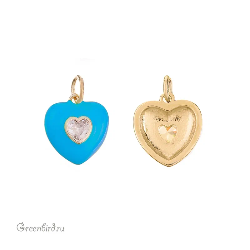 Фурнитура для бижутерии - объемная подвеска в форме сердца с эмалью, украшенная фианитом. Материал: латунь, покрытие: золото. Цвет эмали: голубой. Цвет вставки: прозрачный кристалл. Размер с колечком: 16 х 12 х 4 мм. Производство: Китай. Цена указана за 1 шт.