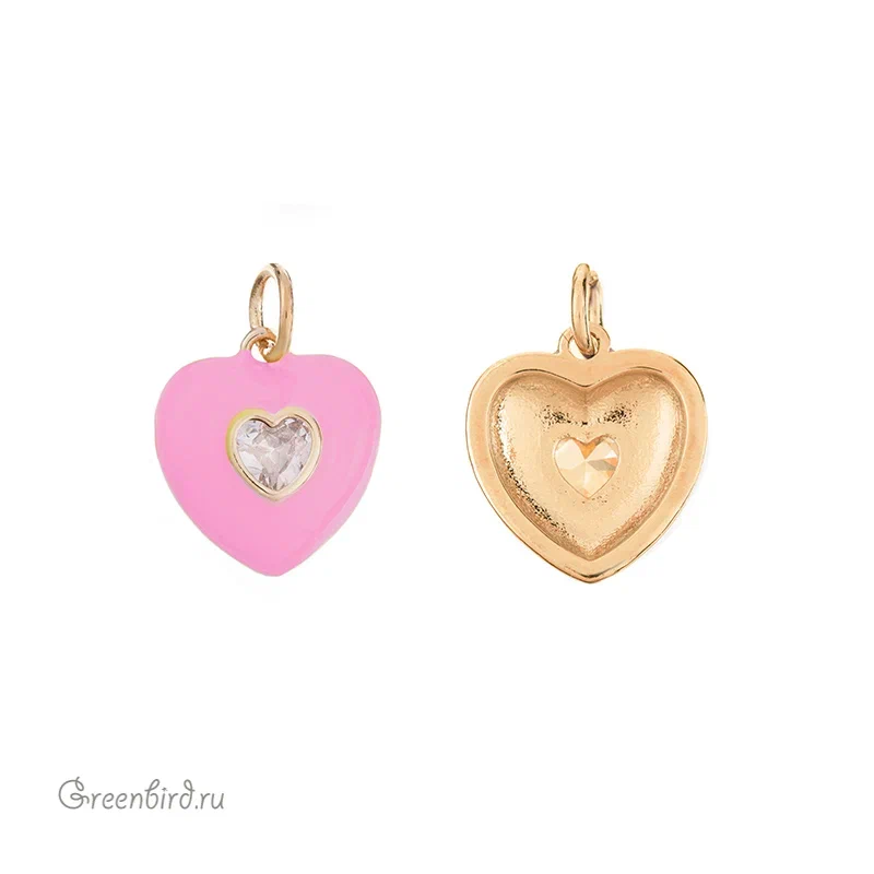 Фурнитура для бижутерии - объемная подвеска в форме сердца с эмалью, украшенная фианитом. Материал: латунь, покрытие: золото. Цвет эмали: розовый. Цвет вставки: прозрачный кристалл. Размер с колечком: 16 х 12 х 4 мм. Производство: Китай. Цена указана за 1 шт.