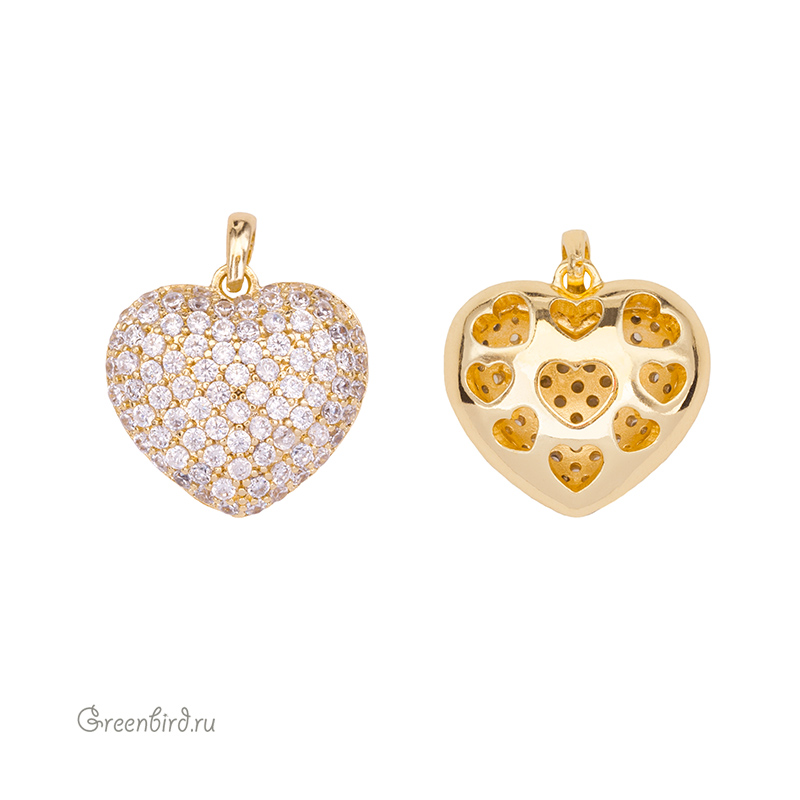 Фурнитура для бижутерии - подвеска объемная в форме сердечка, украшенная фианитами. Материал: латунь, покрытие: золото. Размер с колечком: 14 х 14 x 6,5 мм, внутренний диаметр колечка: 1,2 мм, внутренний размер бейла: 2 х 3 мм. Производство: Китай. Цена указана за 1 шт.