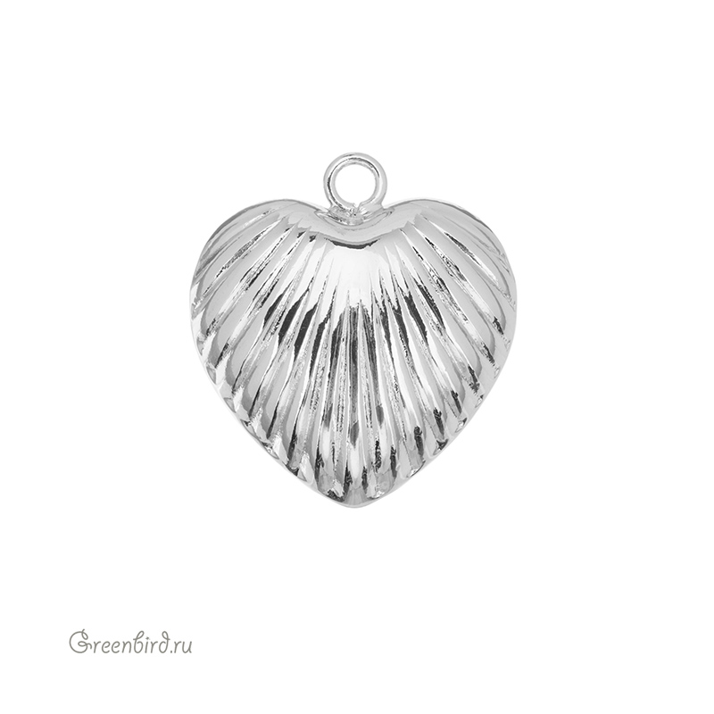 Фурнитура для бижутерии - подвеска в форме сердечка объемная, полая, рифленая поверхность. Материал: латунь, покрытие: родий. Размер с колечком: 28 х 26 мм, толщина: 14 мм, внутренний диаметр колечка: 3 мм. Производство: Китай. Цена указана за 1 шт.