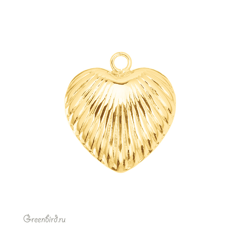 Фурнитура для бижутерии - подвеска в форме сердечка объемная, полая, рифленая поверхность. Материал: латунь, покрытие: золото. Размер с колечком: 28 х 26 мм, толщина: 14 мм, внутренний диаметр колечка: 3 мм. Производство: Китай. Цена указана за 1 шт.
