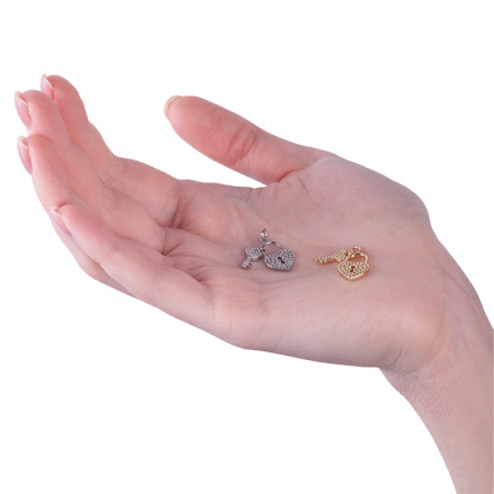 Фурнитура для бижутерии - подвеска в форме замочка-сердца и ключа, инкрустированых фианитами. Материал: латунь, покрытие: родий. Цвет вставки: белый. Размер замочка с колечком: 18 х 10 х 2 мм, размер ключика: 14 х 6 х 2 мм, внутренний диаметр колечка: 3,5 мм. Производство: Китай. Цена указана за 1 шт.