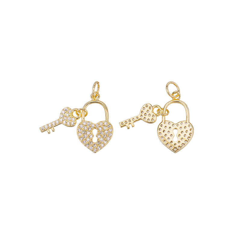 Фурнитура для бижутерии - подвеска в форме замочка-сердца и ключа, инкрустированых фианитами. Материал: латунь, покрытие: золото. Цвет вставки: белый. Размер замочка с колечком: 18 х 10 х 2 мм, размер ключика: 14 х 6 х 2 мм, внутренний диаметр колечка: 3,5 мм. Производство: Китай. Цена указана за 1 шт.