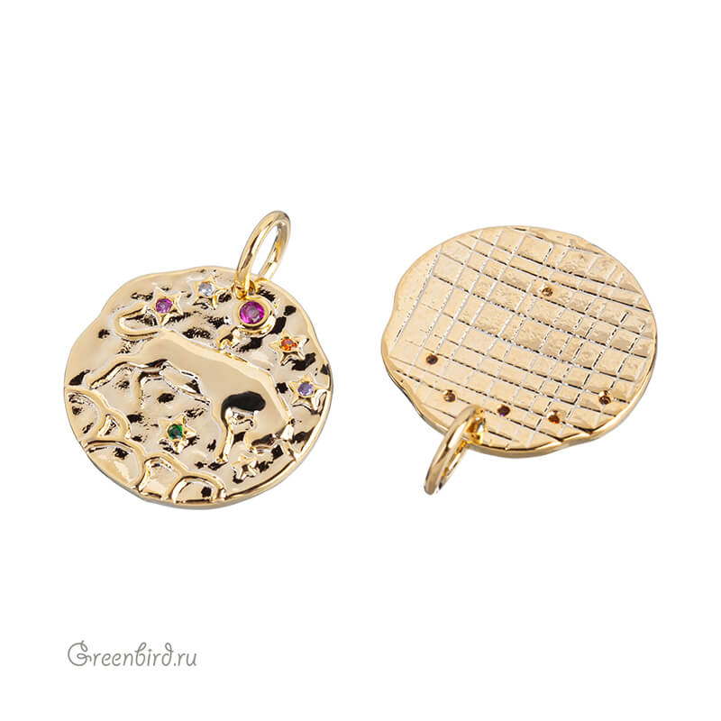 Фурнитура для бижутерии - подвеска односторонняя с зодиакальным символом, украшенная фианитами, с разъемным кольцом. Материал: латунь, покрытие: золото. Цвета фианитов: сиреневый, розовый, оранжевый, зеленый. Размер: 15 х 14,8 мм, толщина: 1,7 мм, кольцо: 5,8 мм, толщина проволоки: 0,9 мм, общая высота: 18,6 мм. Обратите внимание: в зависимости от партии покрытие может быть глянцевым или более матовым. Возможны наплывы покрытия на фианиты. Производство: Китай. Цена указана за 1 шт.