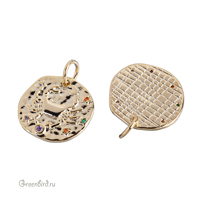 Фурнитура для бижутерии - подвеска односторонняя с зодиакальным символом, украшенная фианитами, с разъемным кольцом. Материал: латунь, покрытие: золото. Цвета фианитов: сиреневый, оранжевый, зеленый, хрусталь. Размер: 15,1 х 14,6 мм, толщина: 1,9 мм, кольцо: 5,6 мм, толщина проволоки: 0,9 мм, общая высота: 18,1 мм. Обратите внимание: в зависимости от партии покрытие может быть глянцевым или более матовым. Возможны наплывы покрытия на фианиты. Производство: Китай. Цена указана за 1 шт.