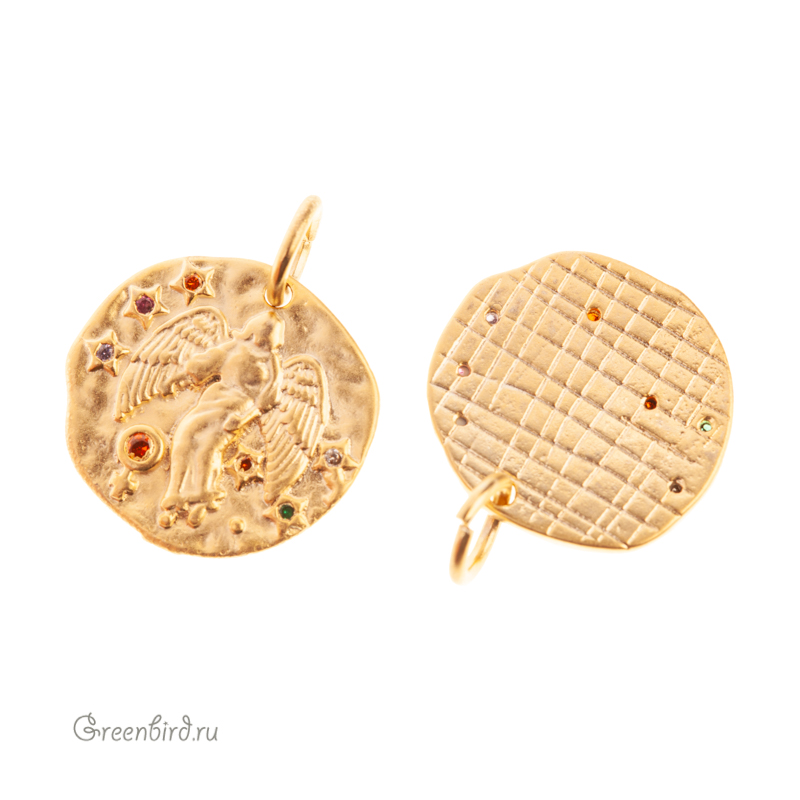 Фурнитура для бижутерии - подвеска односторонняя с зодиакальным символом, украшенная фианитами, с разъемным кольцом. Материал: латунь, покрытие: золото. Цвета фианитов: сиреневый, розовый, оранжевый, зеленый, хрусталь. Размер: 15,3 х 14,5 мм, толщина: 1,8 мм, кольцо: 5,7 мм, толщина проволоки: 0,9 мм, общая высота: 18,8 мм. Обратите внимание: в зависимости от партии покрытие может быть глянцевым или более матовым. Возможны наплывы покрытия на фианиты. Производство: Китай. Цена указана за 1 шт.