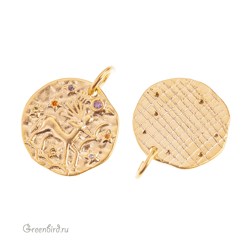 Фурнитура для бижутерии - подвеска односторонняя с зодиакальным символом, украшенная фианитами, с разъемным кольцом. Материал: латунь, покрытие: золото. Цвета фианитов: сиреневый, оранжевый, зеленый, хрусталь. Размер: 15,2 х 14,8 мм, толщина: 1,6 мм, кольцо: 5,8 мм, толщина проволоки: 0,9 мм, общая высота: 19 мм. Обратите внимание: в зависимости от партии покрытие может быть глянцевым или более матовым. Возможны наплывы покрытия на фианиты. Производство: Китай. Цена указана за 1 шт.
