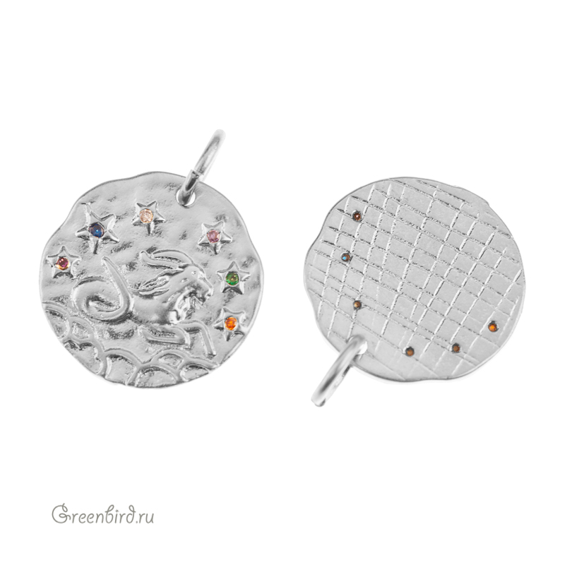 Фурнитура для бижутерии - подвеска односторонняя с зодиакальным символом, украшенная фианитами, с разъемным кольцом. Материал: латунь, покрытие: родий. Цвета фианитов: сиреневый, синий, розовый, оранжевый, зеленый, хрусталь. Размер: 15,1 х 15 мм, толщина: 1,7 мм, кольцо: 5,7 мм, толщина проволоки: 0,9 мм, общая высота: 19 мм. Обратите внимание: в зависимости от партии покрытие может быть глянцевым или более матовым. Возможны наплывы покрытия на фианиты. Производство: Китай. Цена указана за 1 шт.