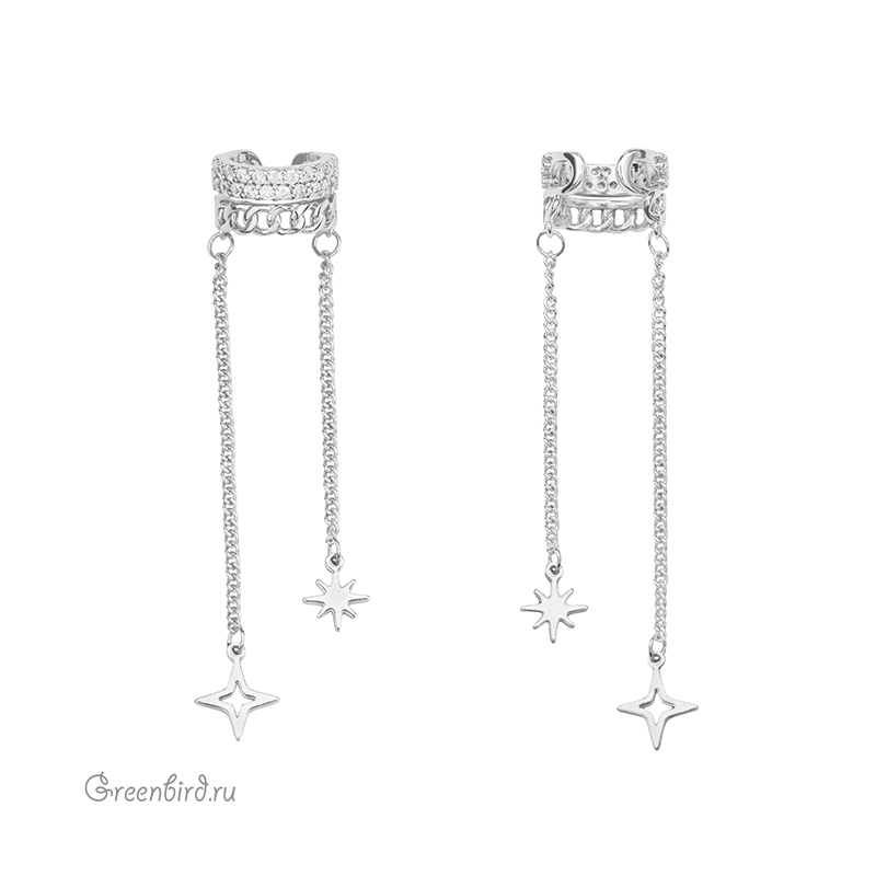 Фурнитура для бижутерии - кафф-кольцо с фианитами (кристальным паве), с цепочками и подвесками в виде звездочек. Материал: латунь, покрытие: родий. Диаметр каффа: 12,5 мм, высота: 8 мм, общая длина с цепочками: 63 мм. Производство: Китай. Цена указана за 1 штуку.