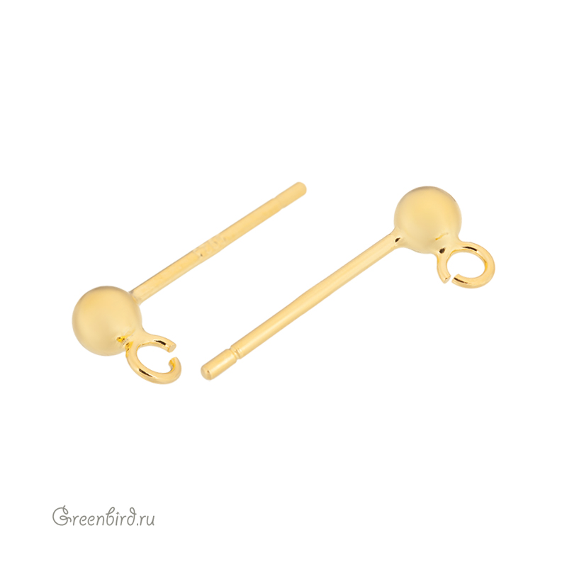 Фурнитура для бижутерии - пуссеты с гладким шариком. Материал: sterling silver, покрытие: яркое золото. Размер декоративного элемента: 3 мм, толщина штырька: 0,75 мм. Обратите внимание: пуссеты продаются без заглушек. Производство: Китай. Цена указана за пару.