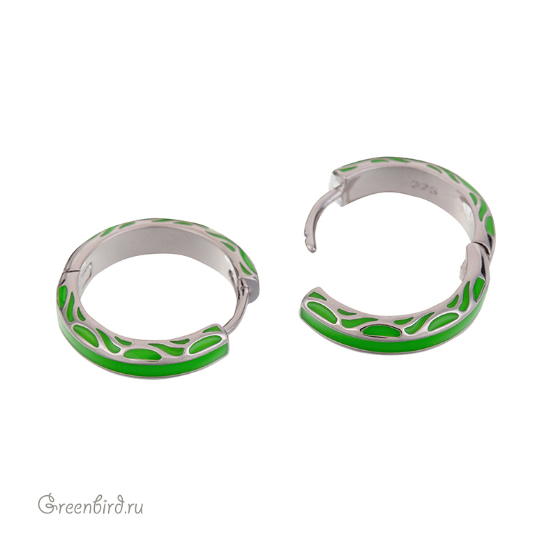 Фурнитура для бижутерии - швензы-кольца без колечек и креплений (серьги-конго), с эмалью. Материал: латунь, покрытие: родий. Цвет эмали: зеленый. Размер: 4,6 х 20 мм, толщина дужки: 1,1 х 1,2 мм, внутренний диаметр: 15,6 мм. Производство: Китай. Цена указана за пару.