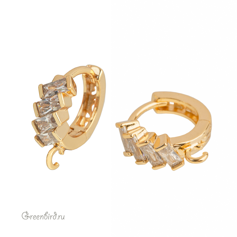 Фурнитура для бижутерии - круглые швензы с фианитами. Материал: латунь, покрытие: золото. Форма огранки фианитов: принцесса (прямоугольник). Размер декоративного элемента: 5 х 11,5 мм, высота швензы с петелькой: 14 мм, толщина дужки: 1,1 мм. Обратите внимание: швензы не зеркальные, в зависимости от партии направление декоративных элементов может отличаться (см. фото).