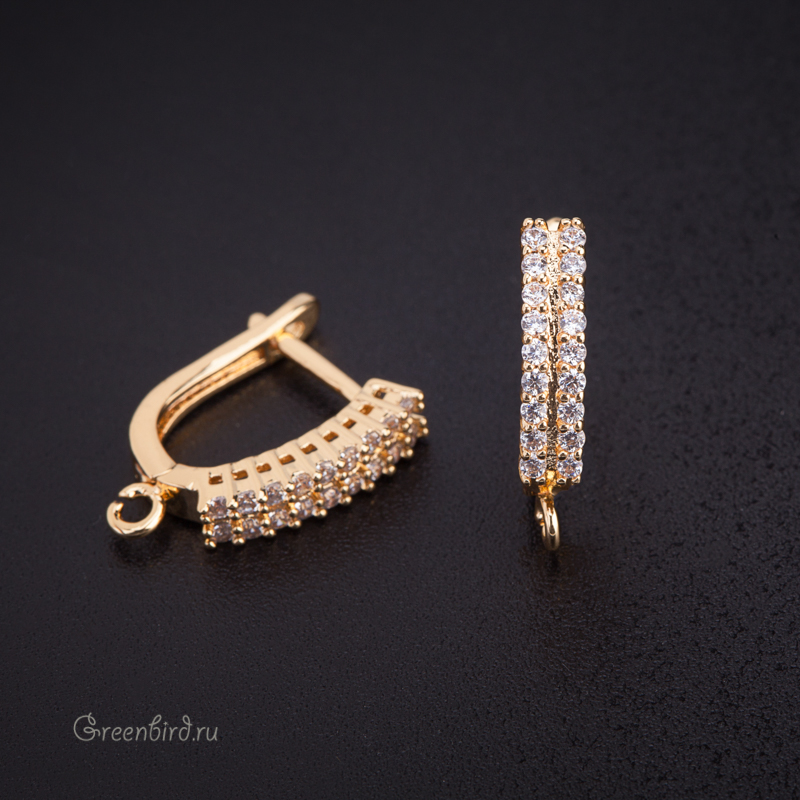 Фурнитура для бижутерии - швензы с английским замком и фианитами. Материал: латунь, покрытие: яркое золото. Размер декоративного элемента с петелькой: 3,7 х 19 мм, толщина дужки 1,3 мм, ширина дужки: 2,5 мм, толщина штырька: 1,2 мм. Производство: Китай. Цена указана за пару.