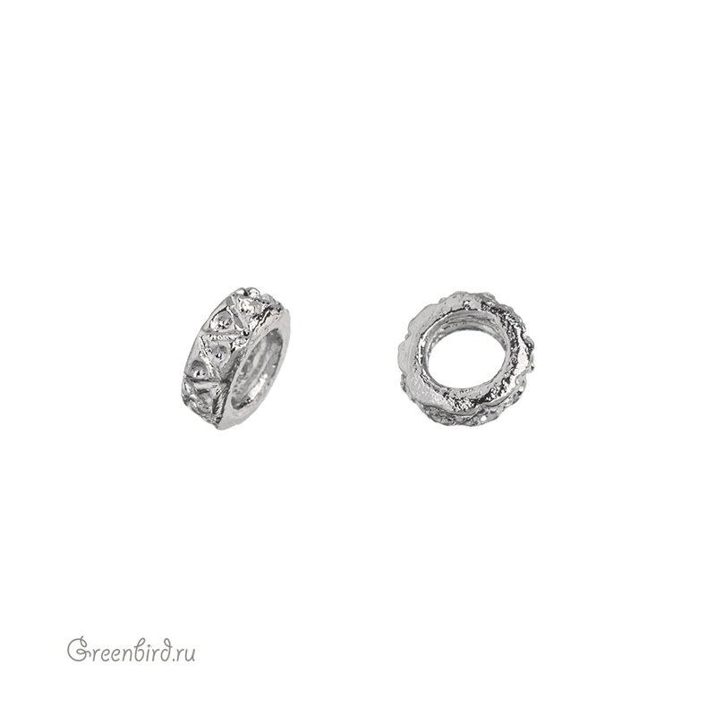 Спейсер (бусина-разделитель) с широким отверстием. Может использоваться как рондель. Материал: пьютер (оловянный сплав), покрытие: родий. Размер: 5,4 х 2,1 мм, диаметр отверстия: 3 мм. Производство: Корея. Цена указана за 1 шт.