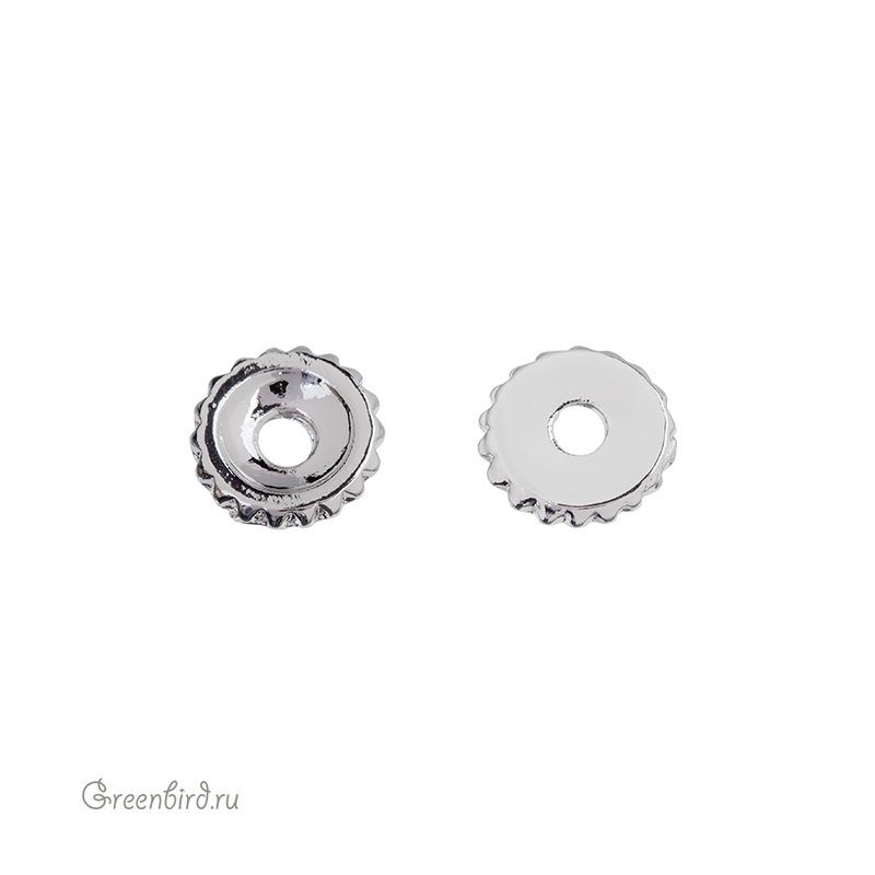 Металлическая бусина-разделитель, плоская с одной стороны. Может использоваться как чашечка для бусины. Материал: латунь, покрытие: родий. Размер: 11,2 х 2 мм, диаметр отверстия: 2,9 мм, внутренний диаметр углубления примерно 7,6 мм. Производство: Корея. Цена указана за 1 шт.