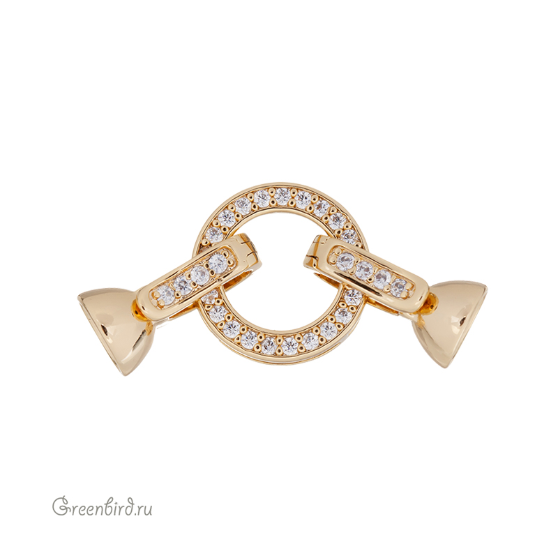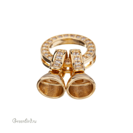 Фурнитура для бижутерии - замок часовой с фианитами в виде неразъемного кольца с двумя застежками. Застежки снабжены колпачками с внутренней перегородкой под нити, шнуры или жгуты. Кольцо имеет отверстия для крепления нитей, также может использоваться отдельно как пришивной элемент. Материал: латунь, покрытие: золото. Общий размер: 36 х 14,5 х 7,5 мм; кольцо: 14,5 мм (внутренний диаметр: 9,4 мм), отверстия: 0,9 х 4,2 мм; размер застегивающейся части (клипсы-крючка) с колпачком: 14,4 х 7,5 мм, максимальный внутренний диаметр колпачков: 5,9 мм. Производство: Китай. Цена указана за 1 шт.