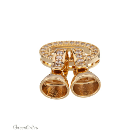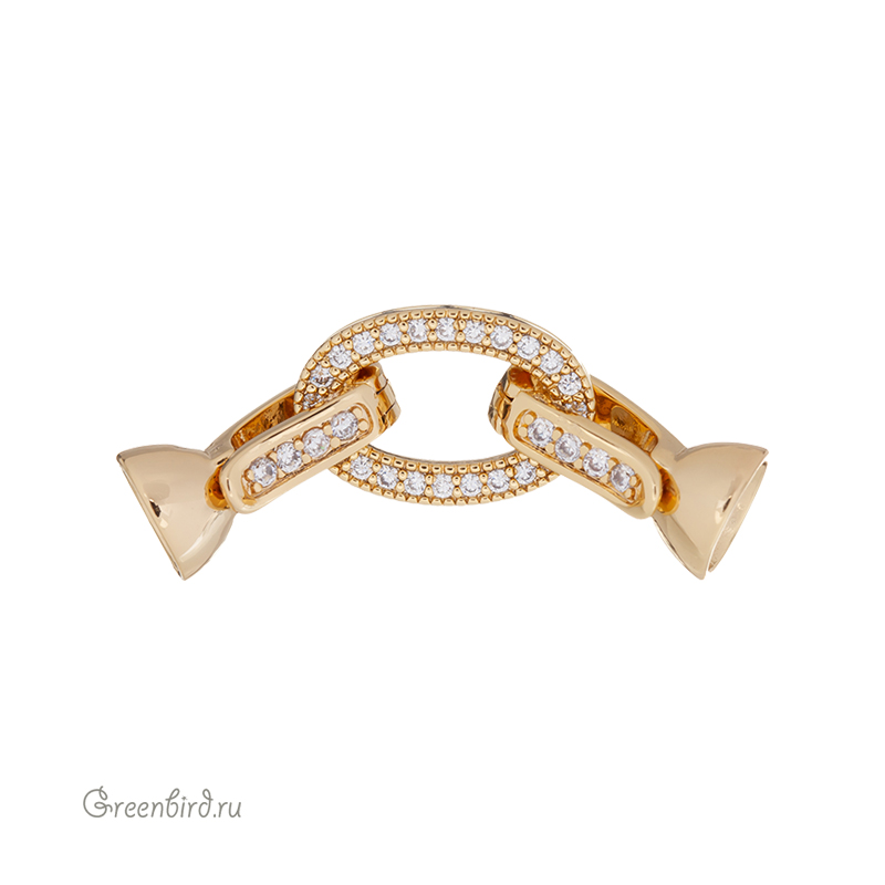 Фурнитура для бижутерии - замок часовой с фианитами в виде неразъемного овального кольца с двумя застежками. Застежки снабжены колпачками с внутренней перегородкой под нити, шнуры или жгуты. Кольцо имеет отверстия для крепления нитей, также может использоваться отдельно как пришивной элемент. Материал: латунь, покрытие: золото. Общий размер: 35,7 х 10,1 х 7,5 мм; кольцо: 15,4 х 10,1 мм (внутренний размер: 10,7 х 5,7 мм), отверстия: 1,9 х 0,5 мм, 3,2 х 0,6 мм и 2,2 х 0,6 мм; размер застегивающейся части (клипсы-крючка) с колпачком: 14,4 х 7,5 мм, максимальный внутренний диаметр колпачков: 5,9 мм. Производство: Китай. Цена указана за 1 шт.