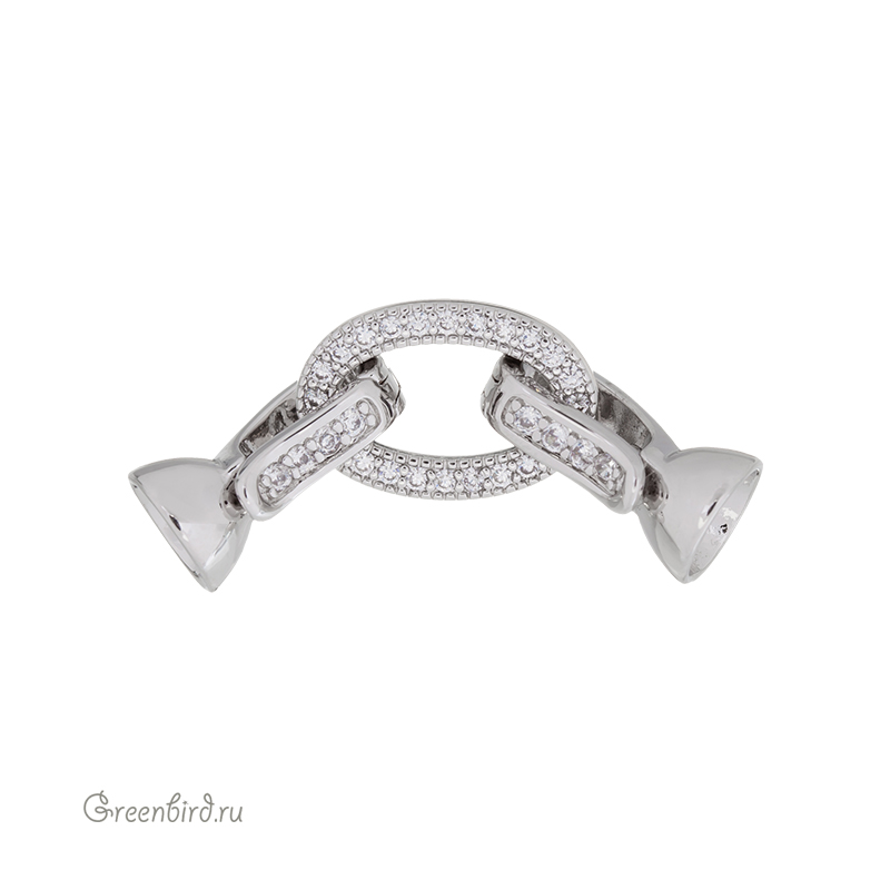 Фурнитура для бижутерии - замок часовой с фианитами в виде неразъемного овального кольца с двумя застежками. Застежки снабжены колпачками с внутренней перегородкой под нити, шнуры или жгуты. Кольцо имеет отверстия для крепления нитей, также может использоваться отдельно как пришивной элемент. Материал: латунь, покрытие: родий. Общий размер: 35,7 х 10,1 х 7,5 мм; кольцо: 15,4 х 10,1 мм (внутренний размер: 10,7 х 5,7 мм), отверстия: 1,9 х 0,5 мм, 3,2 х 0,6 мм и 2,2 х 0,6 мм; размер застегивающейся части (клипсы-крючка) с колпачком: 14,4 х 7,5 мм, максимальный внутренний диаметр колпачков: 5,9 мм. Производство: Китай. Цена указана за 1 шт.
