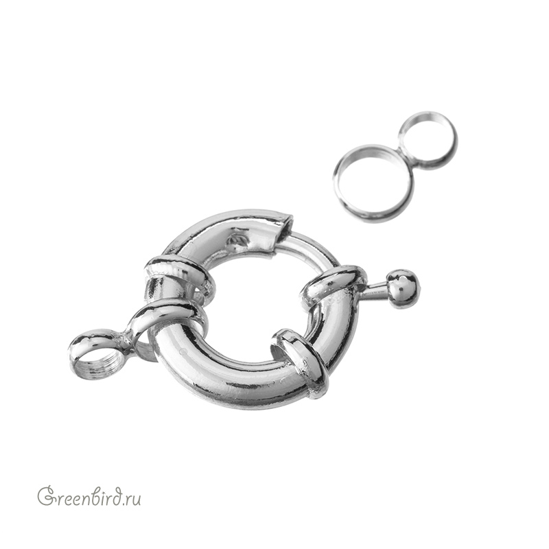 Фурнитура для бижутерии - замок-колечко в виде штурвала c двумя дополнительными неразъемными колечками. Материал: латунь, покрытие: родий. Размер замочка: 15 мм, внутренний диаметр: 8 мм, внутренний диаметр дополнительных колечек: 3,5 мм. Производство: Китай. Цена указана за 1 штуку.