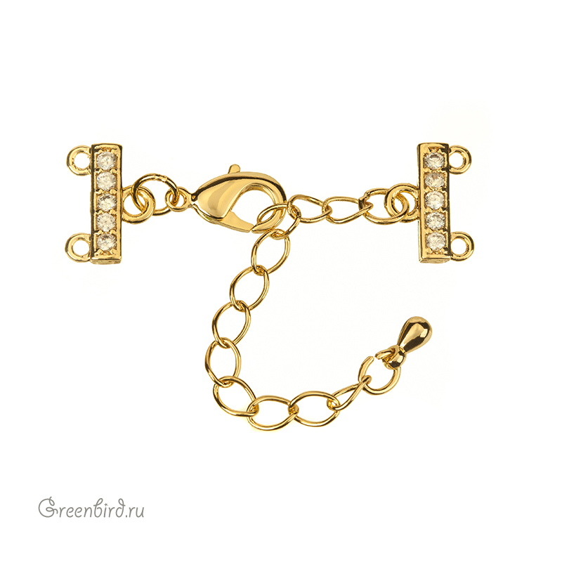 Фурнитура для бижутерии - замок-лобстер с удлинителем и двумя коннекторами на две петли, с одной стороны украшенными фианитами. Материал: латунь, покрытие: золото. В зависимости от партии оттенок покрытия может незначительно отличаться (иметь оттенок светлого серебра). Размер замочка с кольцом: 6,5 х 12,2 мм, размер коннекторов с петельками: 12,2 х 9 мм, цепочка удлинителя: 52 мм, подвеска-капелька: 6 мм. Минимальная длина в застегнутом состоянии - 31 мм, максимальная - 80 мм. Производство: Китай. Цена указана за 1 шт.