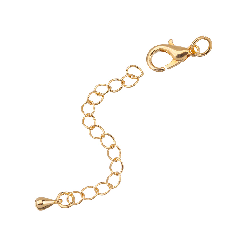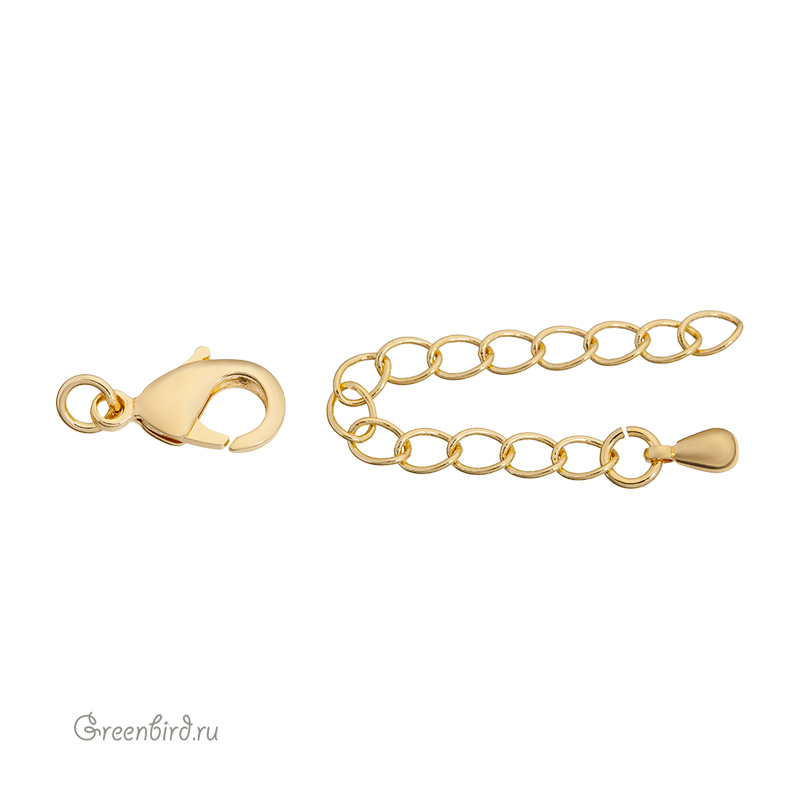 Фурнитура для бижутерии - замок-лобстер с удлинителем. Материал: латунь; покрытие: золото. Размер замка: 12,3 х 6,7 мм, удлинитель (цепочка): 50 мм, подвеска: 5,5 х 2,9 мм, общая длина с колечками минимум 7 см. Производство: Китай. Цена указана за 1 штуку.