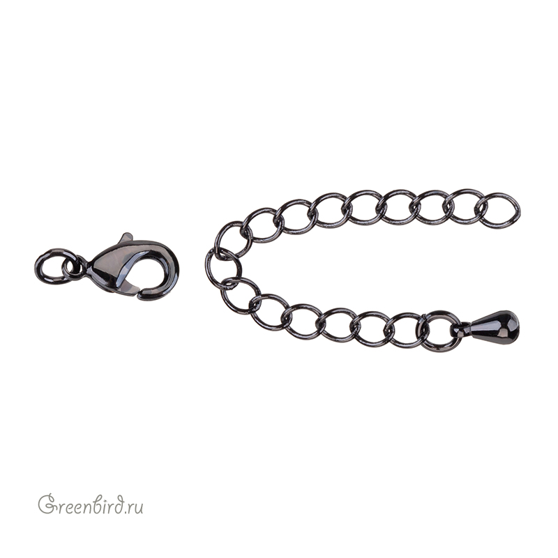 Фурнитура для бижутерии - замок-лобстер с удлинителем. Материал: латунь, покрытие: gunmetal (оружейная сталь). Размер замка: 10 х 5,3 мм, удлинитель (цепочка): 50 мм, подвеска: 5,5 х 2,9 мм, общая длина с колечками минимум 7 см. Производство: Китай. Цена указана за 1 штуку.