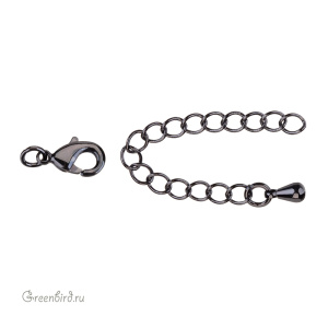 Фурнитура для бижутерии - замок-лобстер с удлинителем. Материал: латунь, покрытие: gunmetal (оружейная сталь). Размер замка: 10 х 5,3 мм, удлинитель (цепочка): 50 мм, подвеска: 5,5 х 2,9 мм, общая длина с колечками минимум 7 см. Производство: Китай. Цена указана за 1 штуку.
