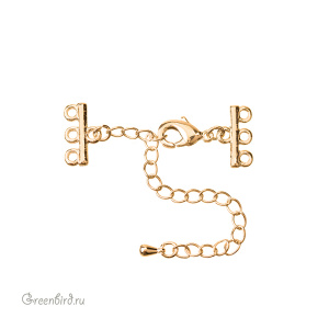 Фурнитура для бижутерии - замок-лобстер с удлинителем и двумя коннекторами на три петли. Материал: латунь, покрытие: золото. Размер замочка с кольцом: 6,7 х 12,3 мм, размер коннекторов с петельками: 14 х 8 мм, цепочка удлинителя: 65 мм, подвеска-капелька: 6 мм. Минимальная длина в застегнутом состоянии - 32 мм, максимальная - 93 мм. Производство: Китай. Цена указана за 1 штуку.