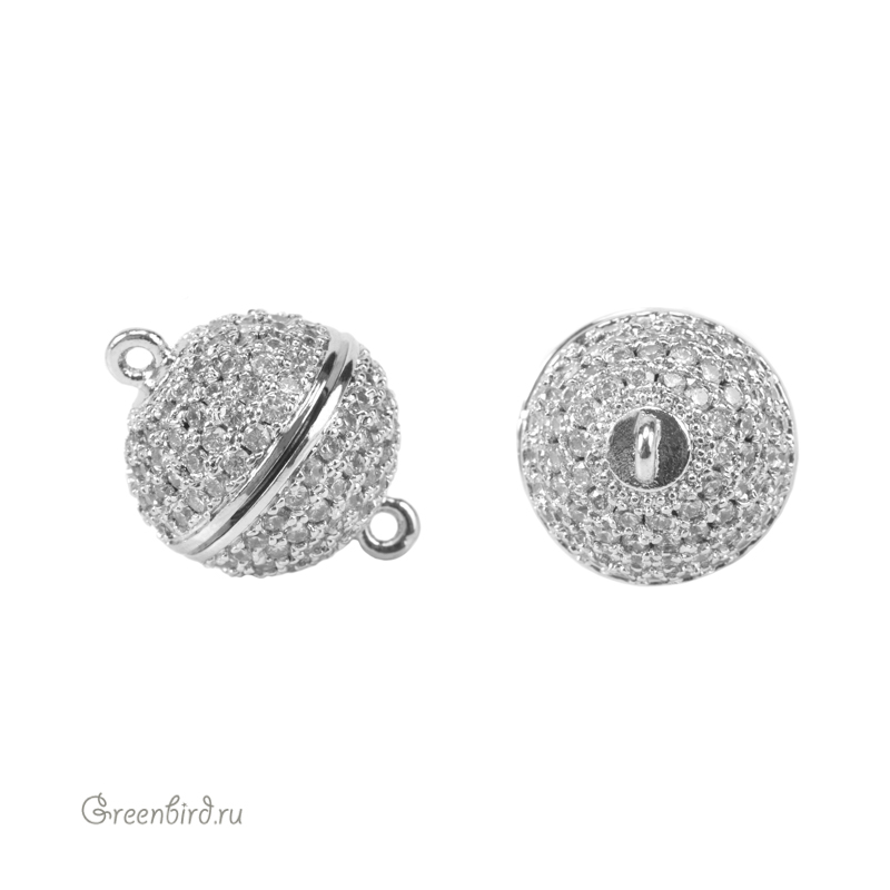Корейская фурнитура для бижутерии - магнитный замок в форме шара с фианитами. Материал: латунь, покрытие: родий. Диаметр шара: 12 мм, размер с петельками: 16 мм. Производство: Китай. Цена указана за 1 шт.