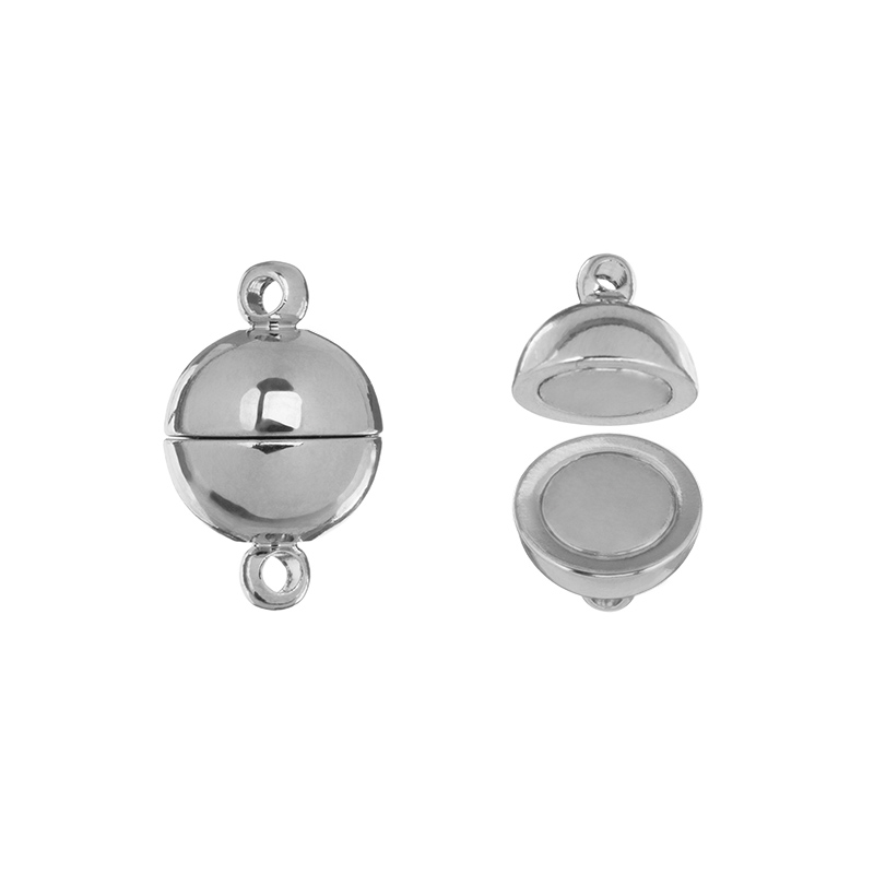 Фурнитура для бижутерии - магнитный замок в форме шара. Материал: латунь, покрытие: родий. Диаметр шара: 10 мм, размер с петельками: 16 мм, внутренний диаметр петелек: 1,6 мм. Производство: Китай. Цена указана за 1 шт.